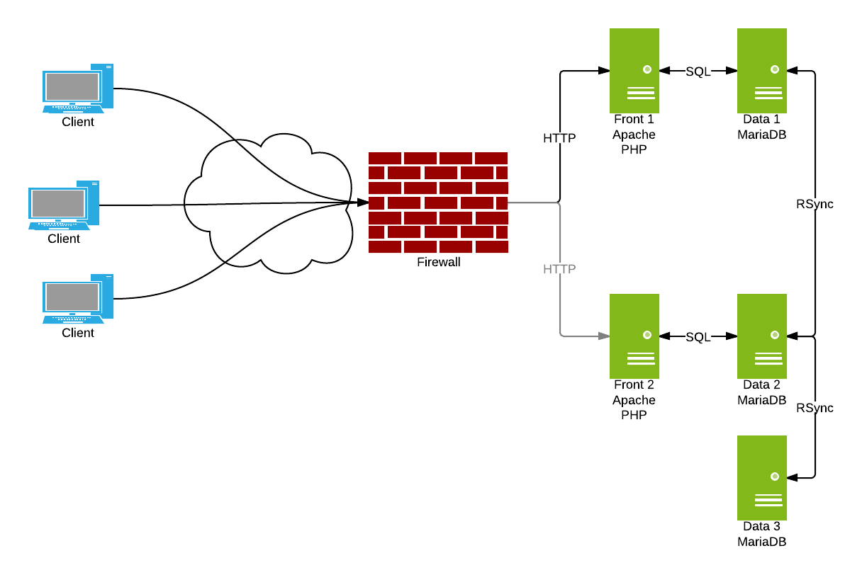 Voici une architecture typique avec un Fail Over en place de Front1 vers Front2 :
